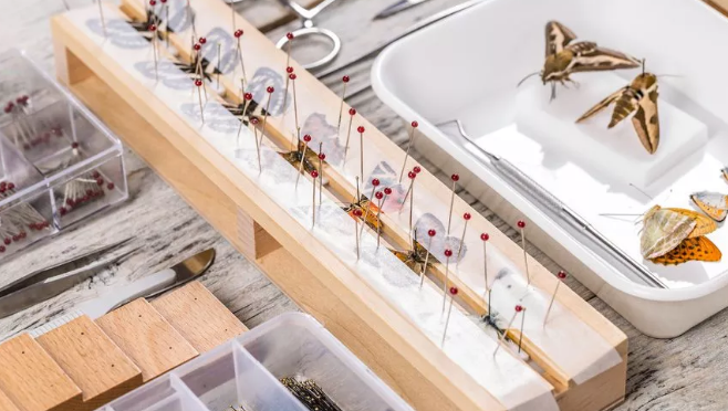 常用的昆虫标本制作工具包括:昆虫针、展翅板、硫酸纸、整姿台、三级台、还软器等。