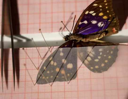 之后,用昆虫针或者大头针固定前翅,注意针尖不要插到蝶翅上,以免造成标本损伤: